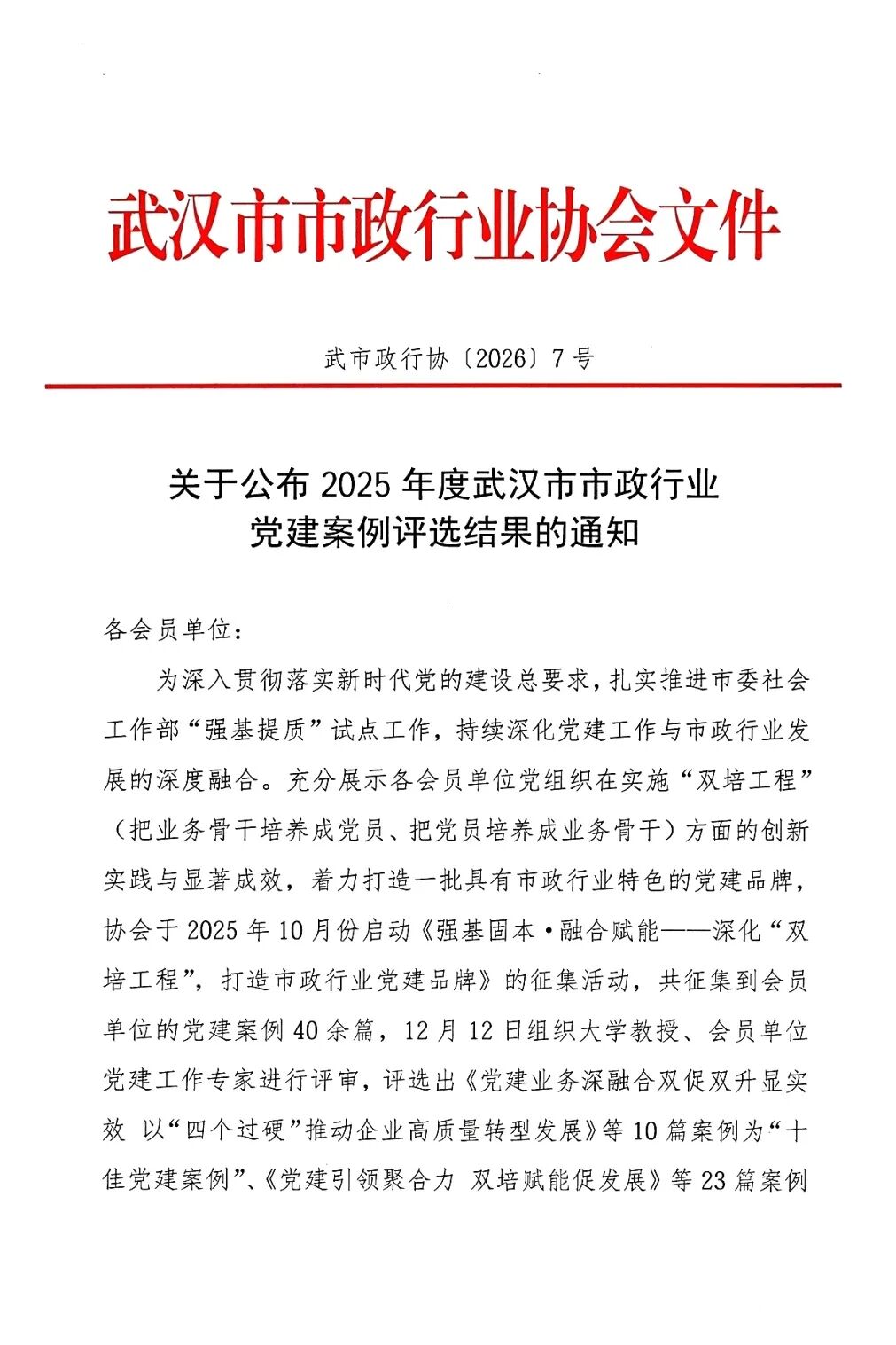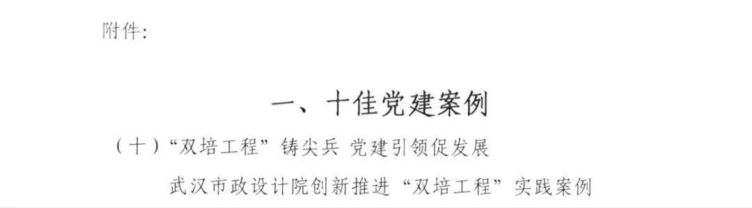 ? ? 近日,武漢市市政行業(yè)協(xié)會發(fā)布《2025年度武漢市市政行業(yè)黨建案例評選結果》,武漢市政院申報的創(chuàng)新實踐案例——《“雙培工程”鑄尖兵,黨建引領促發(fā)展》入選“十佳黨建案例”。
