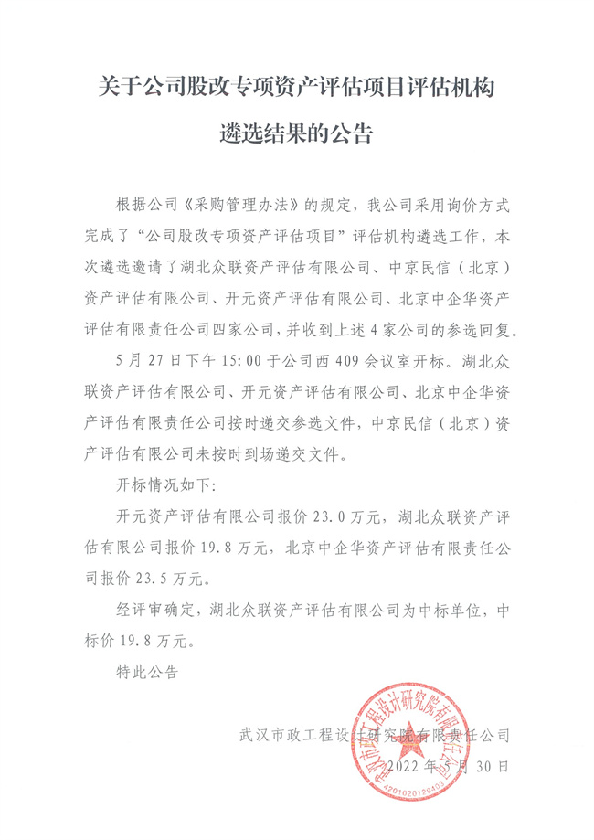 關(guān)于公司股改專項(xiàng)資產(chǎn)評(píng)估項(xiàng)目評(píng)估機(jī)構(gòu)遴選結(jié)果的公告