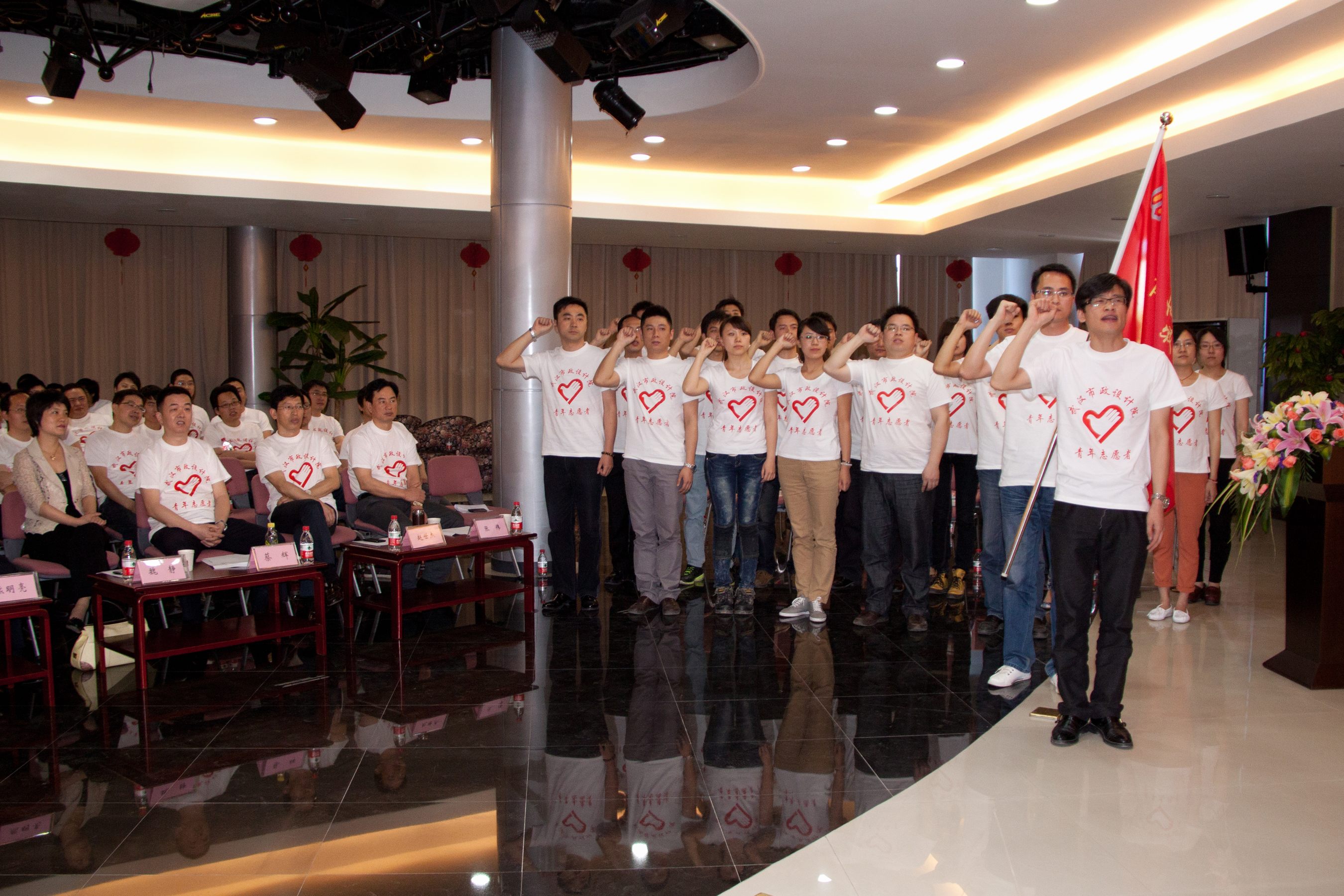 ??? 青年員工代表周鼎手持青年志愿者的旗幟走入會場,公司青年志愿者先鋒隊(duì)成立儀式正式開始。市城建委副主任熊明亮同志接過旗幟,并親手將其交給青年志愿者先鋒隊(duì)隊(duì)長李威。20名青年志愿者代表走到會場前排莊嚴(yán)宣誓。隨后,公司團(tuán)總支書記張茂會鄭重宣布:公司青年志愿者先鋒隊(duì)成立。