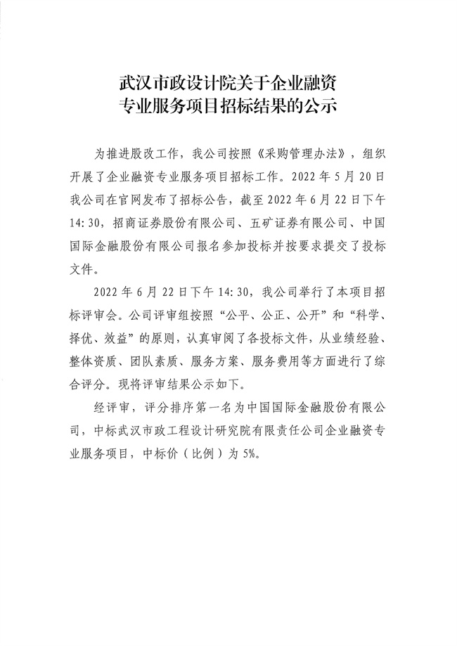 關(guān)于企業(yè)融資專業(yè)服務(wù)項(xiàng)目招標(biāo)結(jié)果的公示