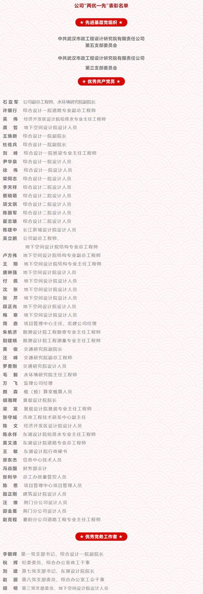 公司綜合設(shè)計一院道路專業(yè)副總工程師許銀行、經(jīng)濟開發(fā)區(qū)設(shè)計院給排水專業(yè)主任工程師吳偉、地下空間設(shè)計院設(shè)計人員龔哲榮獲市城投集團公司“優(yōu)秀共產(chǎn)黨員”稱號;
