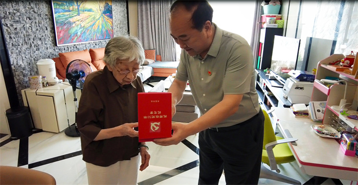 公司黨委書記、董事長(zhǎng)武興治來到離休老黨員陶潛的家中,為她佩戴“光榮在黨50年”紀(jì)念章,并送上慰問金。武興治親切詢問了陶老的身體和生活狀況,感謝她為公司發(fā)展做出的突出貢獻(xiàn),叮囑她保重身體,尤其要注意防暑降溫,并祝愿她健康長(zhǎng)壽。